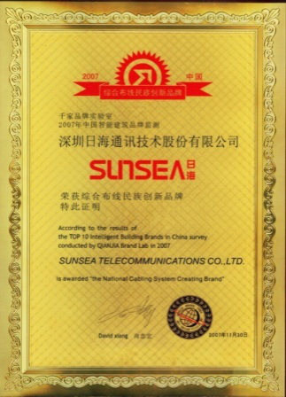 2007年11月29日~30日,南宫ng28公司智能综合布线受邀前往上海光大会展中心酒店,参加由千家网筹办的“2007年第八届中国国际建筑智能化峰会暨颁奖典礼”,获得了“布线民族创新品牌”特别奖项。